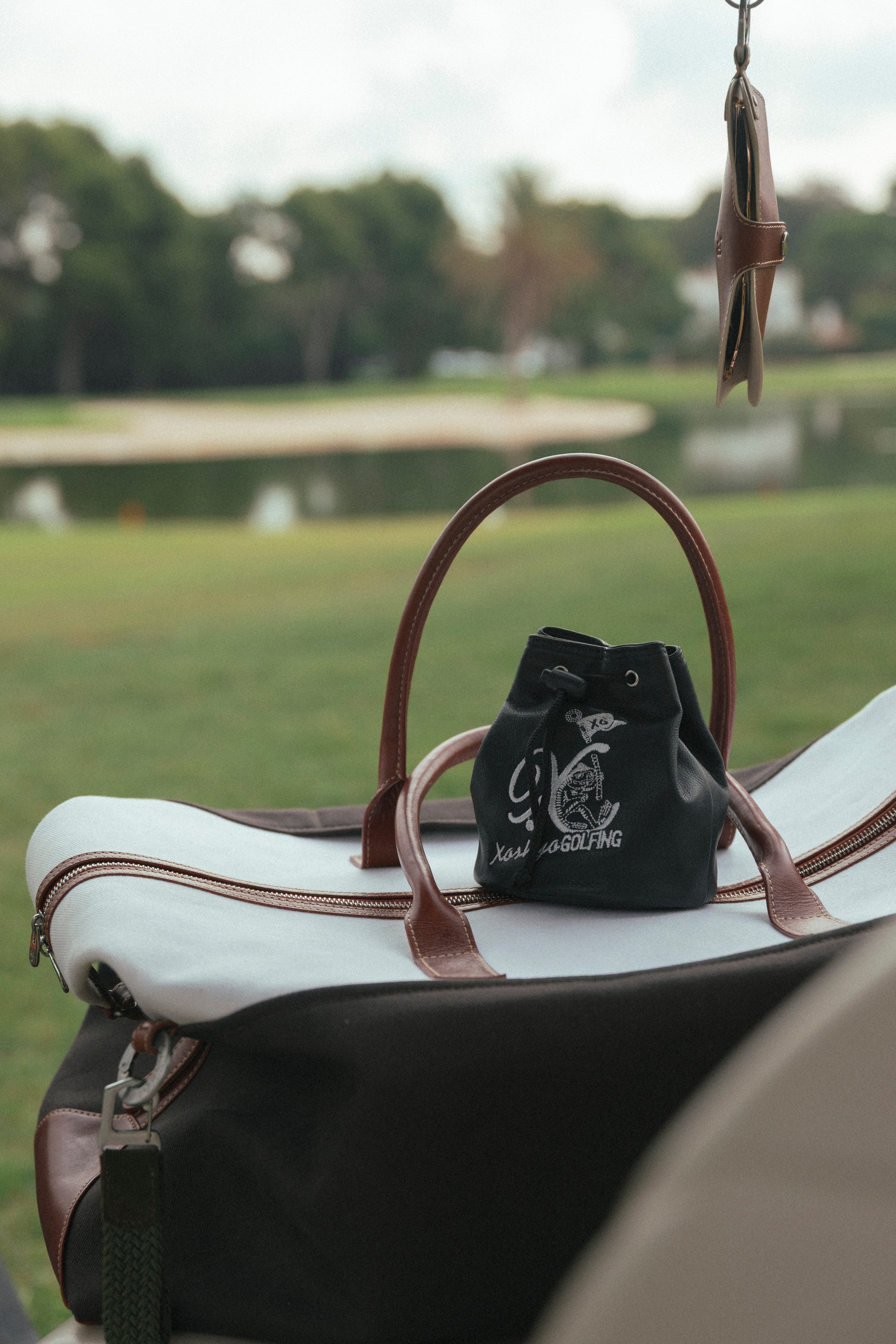 Leather golf ball bag. Ideal for carrying not only golf balls but also anything else you want to keep close at hand. Adjustable drawstring closure.